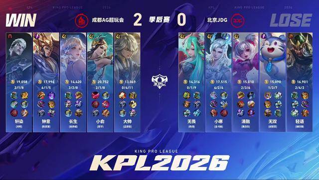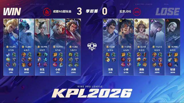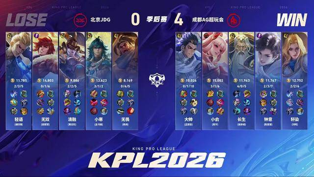 第四局JDG总算是拿到了优势,就当大家以为他们要拿一分的时候,小寒出现了失误。长生的姜子牙闪现烫到苍,元坦大招进场,夏洛特绕后切入,小寒的苍直接没了。轻语的狂铁面对四个人的集火也扛不住了。另一边轩染的夏洛特切死了女娲,AG打了一波零换三。19分钟AG先手开龙,JDG还不想放,无双的老虎跳进去被控了,钟意稳稳控下黑暴。苏烈大招拍三个,但JDG的伤害完全不够,公孙离先点死苏烈再杀狂铁。小俞和钟意继续追JDG中射,在高地前元坦控到女娲,姜子牙完成收割,最终AG4-0战胜JDG,挺进胜者组决赛。