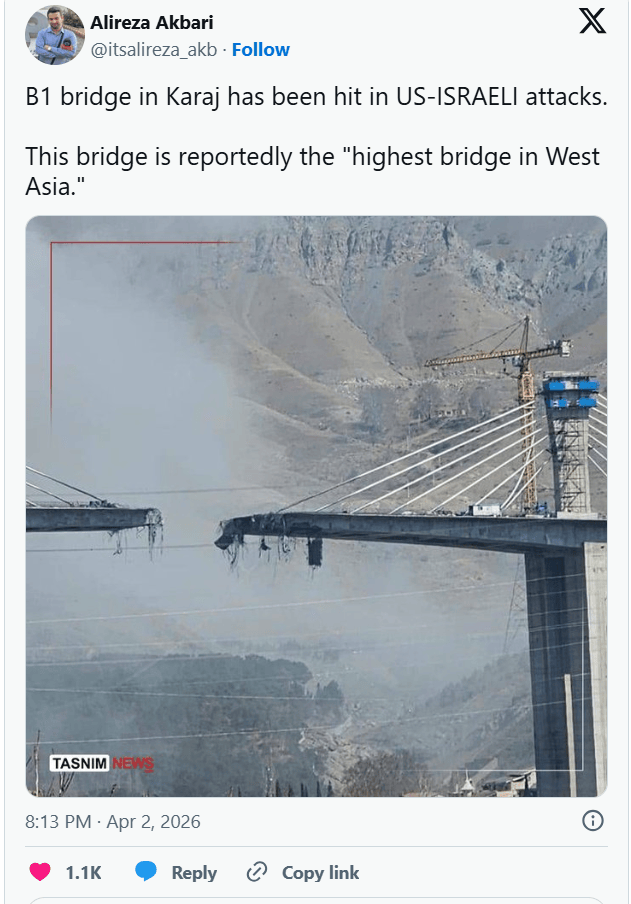 此后,伊朗最高桥梁——连接德黑兰与卡拉季的大桥——遭到摧毁。据援引报道说,美以当天的袭击目标是贝伊克公路桥,该桥是伊朗工程界的标杆项目,被称为全球最复杂的工程成就之一,属于德黑兰-卡拉季交通走廊的核心道路基础设施,原计划于近期正式投入运营。