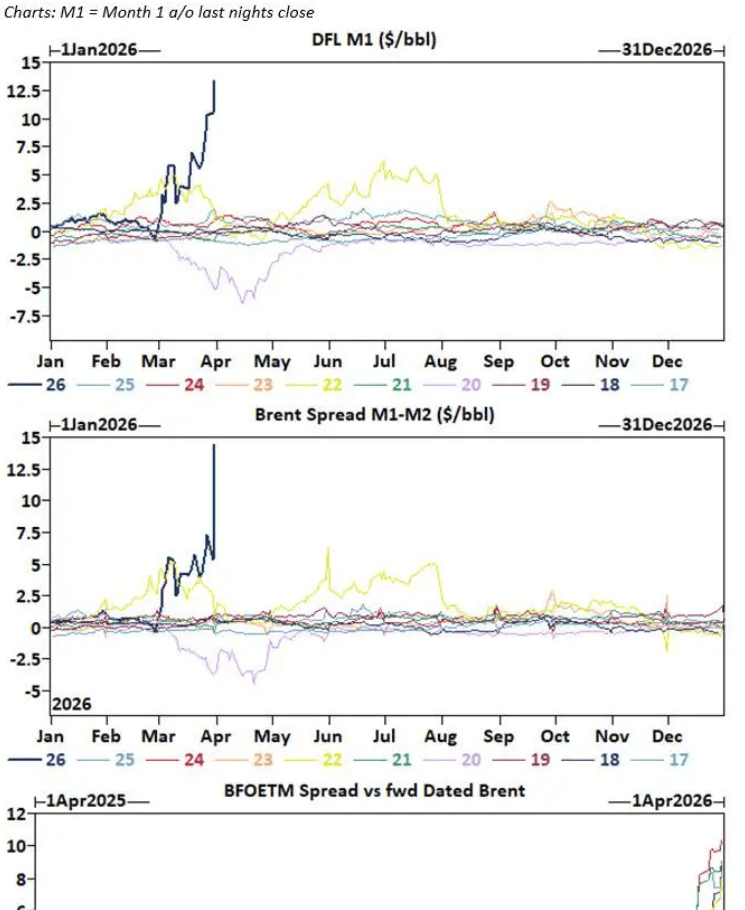 现货端,Dated Brent(北海现货原油,全球实物原油最重要的定价基准)一度触及141.37美元/桶,为2008年以来最高水平。与此同时,期货端布伦特原油下跌约2美元/桶。