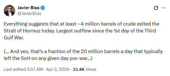 据能源和大宗商品记者Javier Blas在X平台发文:"所有迹象显示,今天至少约400万桶原油流出了霍尔木兹海峡,这是第三次海湾战争开战首日以来的最大单日流出量。"