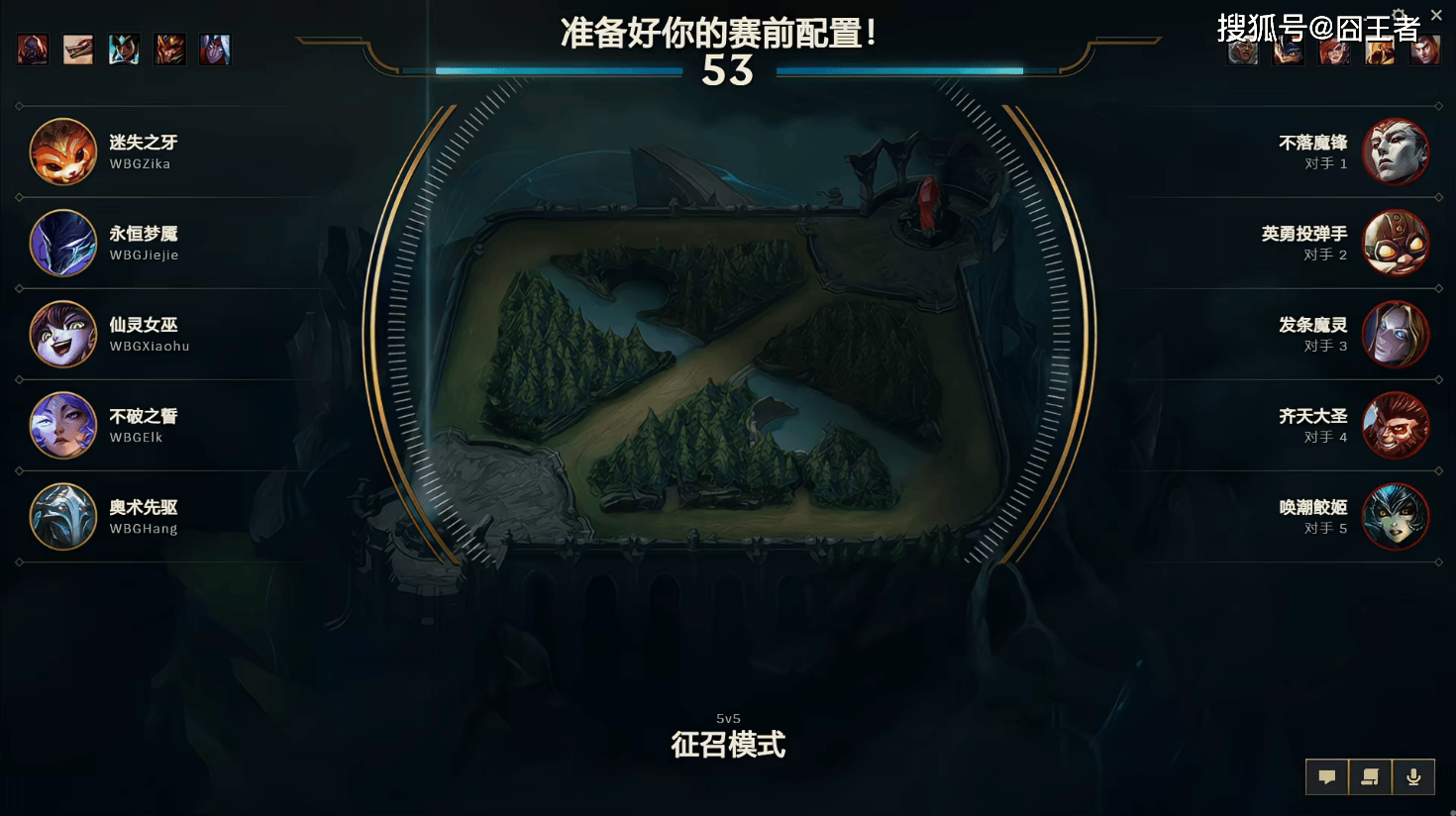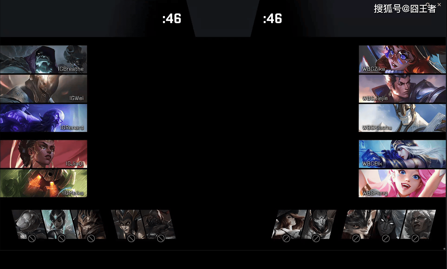 第一局比赛,IG蓝色方,禁用:发条、卡尔玛、皇子、蛇女、塞恩,选用:Breathe掘墓、Wei潘森、Renard瑞兹、JiaQi梅尔、Meiko泰坦;WBG红色方,禁用:安蓓萨、韦鲁斯、兰博、烬、女枪,选用:Zika阿萝拉、Jiejie赵信、Xiaohu加里奥、Elk艾希、Hang萨勒芬妮